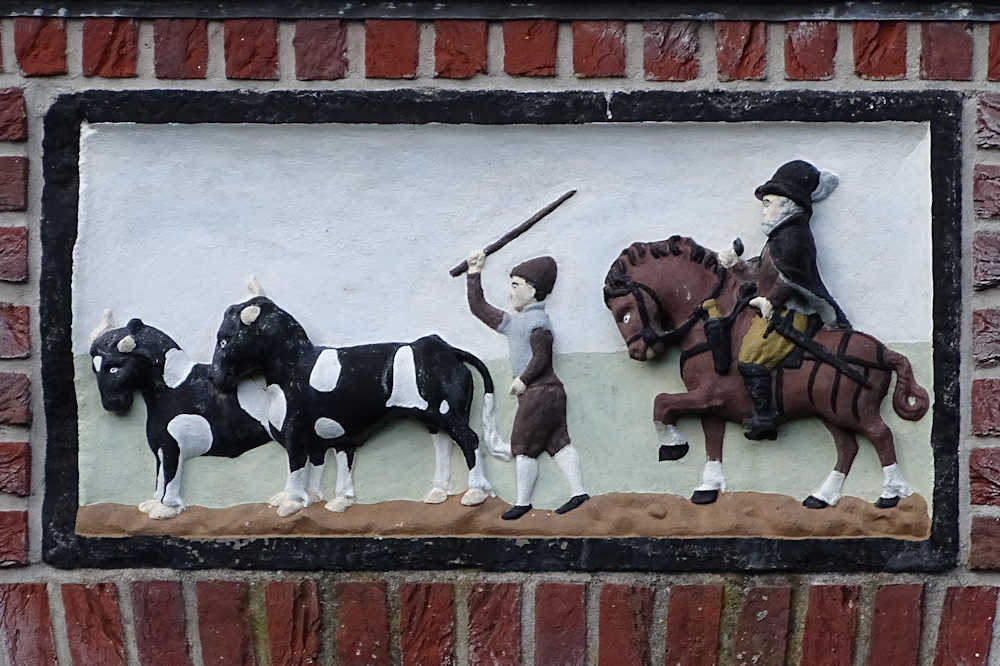 De steen toont een eenvoudig geklede man, die rundvee opdrijft. Hij wordt gevolgd door een statiger geklede ruiter te paard. Er bestaat geen mondelinge of schriftelijke informatie over de betekenis van de uitbeelding op de steen. Men kan veronderstellen dat hier een boerenknecht of pachter en zijn (land)heer zijn afgebeeld. Sommigen beweren dat de afbeelding een voorstelling is van een inbeslagname van vee door de Spanjaarden tijdens de Tachtigjarige Oorlog, in verband met hun voedselvoorziening. De ruiter zou dan een Spaanse officier zijn, of zelfs de Spaanse landvoogd Alva, als zinnebeeld van de Spaanse bezetting.